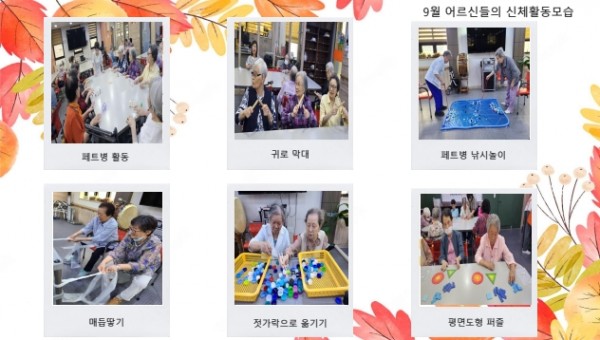 9월 신체활동 페이지 정보 작성자 최고관리자 작성일25-10-02 11:52 조회568회 댓글0건 관련링크 이전글 다음글 목록 본문 9월 어르신 신체활동 사진 입니다. 댓글목록 등록된 댓글이 없습니다. 이전글 다음글 목록