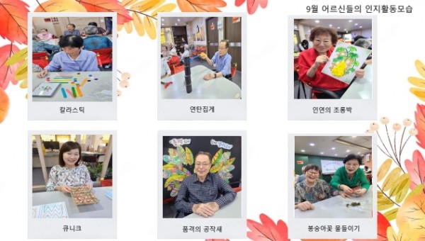 9월 인지활동 페이지 정보 작성자 최고관리자 작성일25-10-02 11:52 조회590회 댓글0건 관련링크 이전글 다음글 목록 본문 9월 인지활동 사진입니다. 댓글목록 등록된 댓글이 없습니다. 이전글 다음글 목록